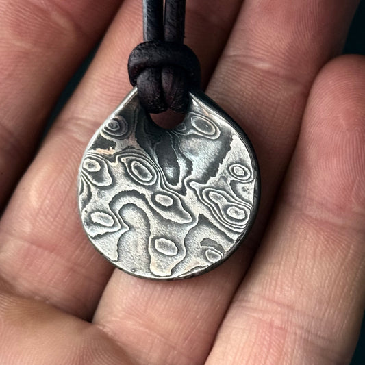 Damascus PENDANT. Forged in Montana. Unique. Layered Steel. Rugged. Leather cord. Necklace. Gifts. For him. For her. Jewelry. Best seller